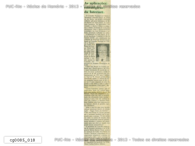 "As aplicações estratégicas da Internet", com depoimento do Prof. Carlos Lucena quando este era o coordenador da comissão de Sociedade de Informação do Conselho Nacional de Ciência e Tecnologia. |
