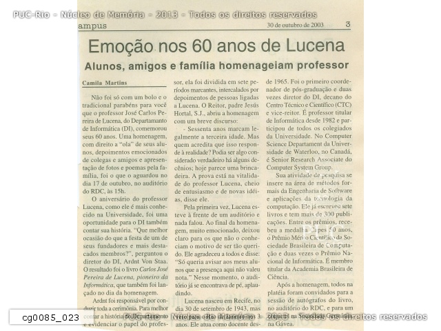 "Emoção nos 60 anos de Lucena", sobre a homenagem pelos 60 anos do prof. Lucena, ocorrida em 17/10/2003 no auditório do RDC. |