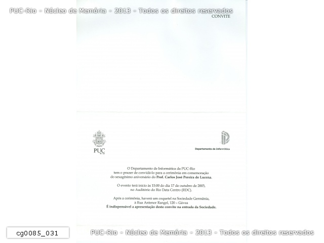 Convite para a comemoração do sexagésimo aniversário do Prof. Carlos José Pererira de Lucena, no auditório do RioDataCentro (RDC), 15:00h, 17/10/2003, seguida por coquetel na Sociedade Germânia, na Gávea. |