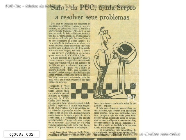 Safo, da PUC, ajuda Serpro a resolver seus problemas; sobre um "Sistema Automático de Formalização do Conhecimento", com depoimento do Prof. Lucena. |