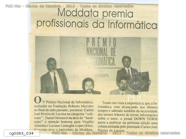 "Moddata premia profissionais da Informática", V Prêmio Nacional de Informática, da Fundação Roberto Marinho, o Prof.Lucena foi premiado na categoria software. |