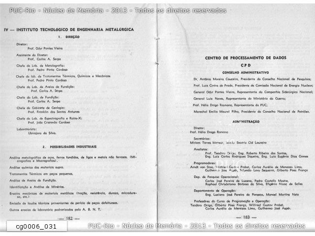 Páginas 182 e 183 do Catálogo Escolar do Centro Técnico Científico. Instituto Tecnológico de Engenharia Metalúrgica e Centro de Processamento de Dados. |