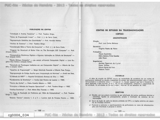 Páginas 188 e 189 do Catálogo Escolar do Centro Técnico Científico. Publicações do Centro de Processamento de Dados; Centro de Estudos em Telecomunicações: Administração, Histórico e Objetivos. |
