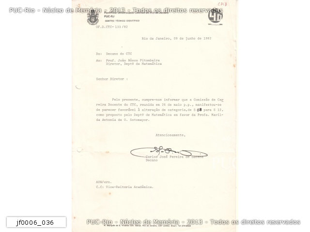Do decano do CTC, prof. Lucena, ao diretor do Departamento de Matemática, prof. Pitombeira, sobre a alteração de categoria da profa. Marilda Sotomayor. |