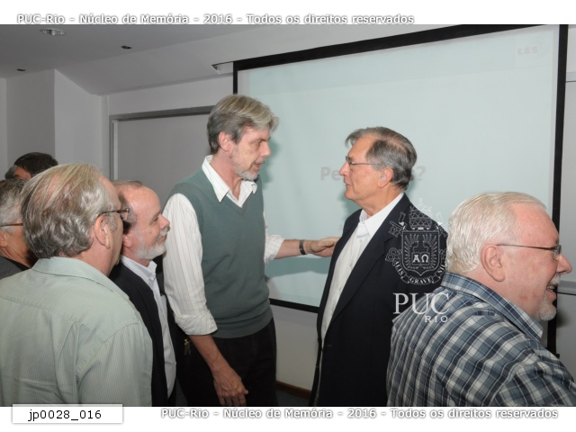 O professor Arndt von Staa recebe os cumprimentos do prof. Rogério Werneck. |