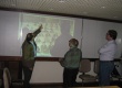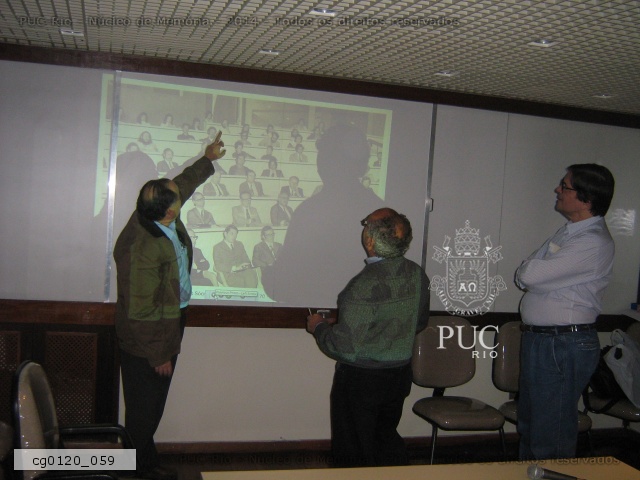 Professores e funcionários veem as fotos do acervo do Núcleo de Memória exibidas em telão. O Prof. Luiz Roberto Cunha (ECO) identifica uma pessoa em foto, com a ajuda do Prof. Augusto Sampaio (COM) e do Prof. Flávio Hasselmann (CETUC). |