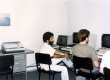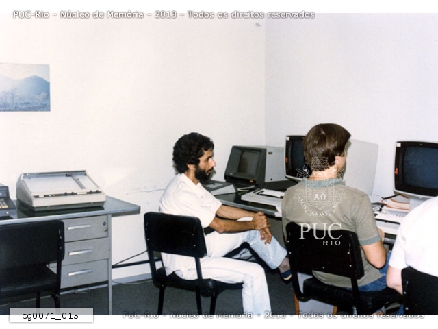 Pesquisadores usam terminais de computadores em sala do CETUC. Na mesa, um plotter. |