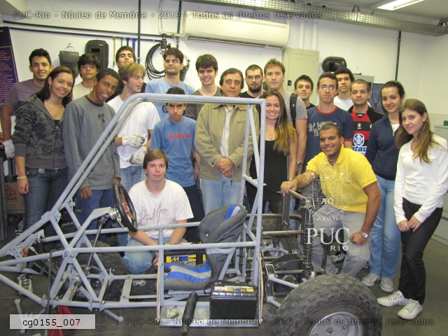 Alunos poosam em torno do veículo mini baja off road no Laboratório Reptiles. |