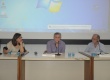Mesa com professores palestrantes e plateia presente ao evento. |