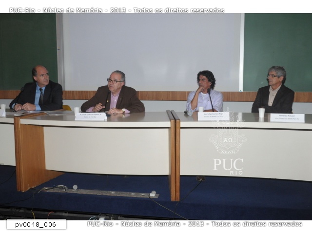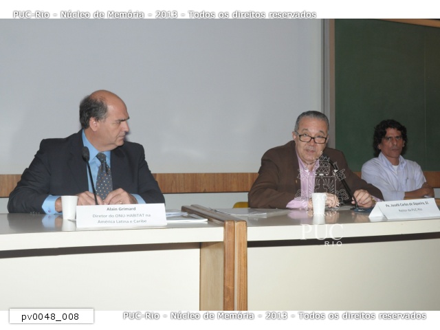 A PUC-Rio foi designada para celebrar o Dia Mundial do Habitat de 2011 no Rio de Janeiro. Na imagem, aparece o debate Cidades e Mudanças Climáticas, parte da Celebração Global que compunha o evento. Na mesa, estão Alain Grimard, diretor da ONU HABITAT na América Latina e Caribe, o reitor Padre Josafá e o diretor do NIMA, Professor Luiz Felipe Guanaes Rego. |