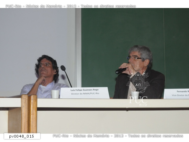 A PUC-Rio foi designada para celebrar o Dia Mundial do Habitat de 2011 no Rio de Janeiro. Na imagem, os professores Luiz Felipe Guanaes Rego e Fernando Cavalcanti Walcacer, diretor e vice-diretor do NIMA, falam algumas palavras na mesa de debate Cidades e Mudanças Climáticas, parte da Celebração Global que compunha evento. |