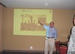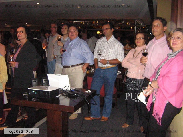 Confraternização ao final do dia, com exibição de fotos do dia e fotos antigas do acervo do Núcleo de Memória. O prof. Luiz Roberto Cunha comenta uma foto de 1968. |