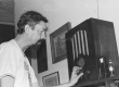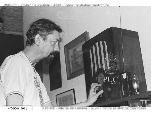 Professor Manoel Wambier em sua residência com rádio antigo e tv portátil da sony (Watchman). |