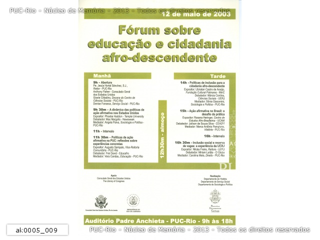 Cartaz do evento Fórum sobre educação e cidadania afro-descendente. Apoio do Consulado Geral dos Estados Unidos e da Library of Congress/USA. Temas: ação afirmativa, política de cotas e inclusão para a cidadania afro-descendente. |