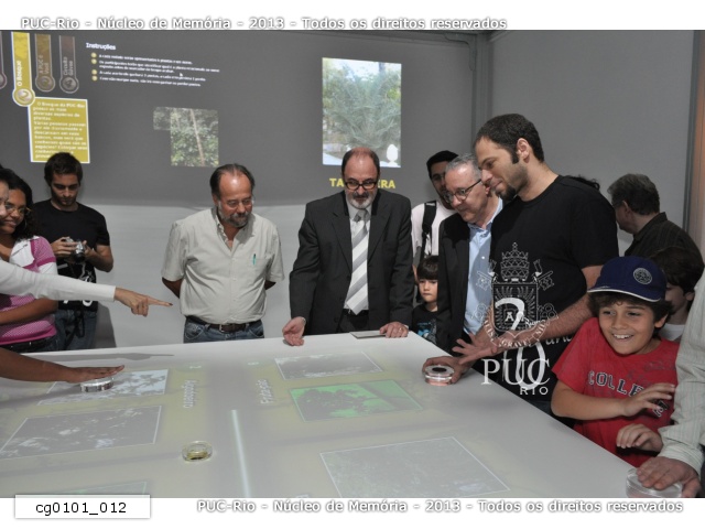 O Reitor Padre Josafá Carlos de Siqueira S.J. visita a exposição. Sala de jogos interativos em mesa digitalizadora, de memória e de conhecimentos sobre a PUC-Rio. |