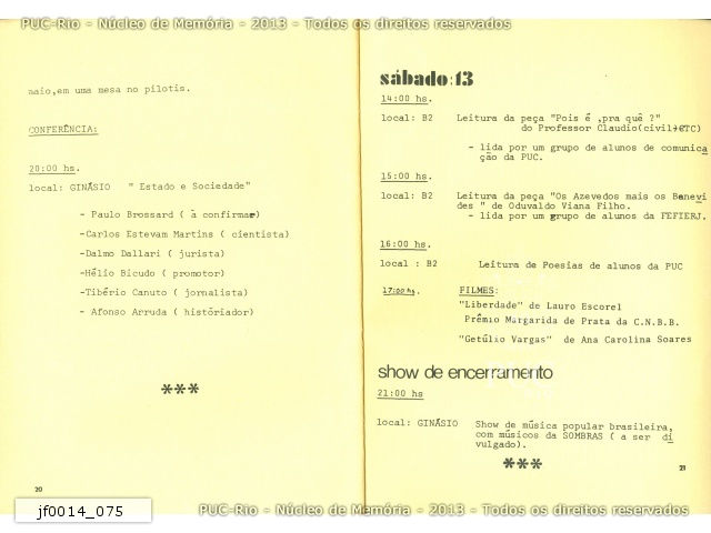 Páginas 20 e 21. Atividades de sexta-feira e sábado. Conferência Estado e Socieda, no Ginásio esportivo, e show de encerramento. |