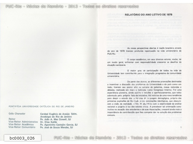 O Relatório apresenta o balanço das atividades acadêmicas da PUC-Rio do ano de 1978. A publicação contém informações do corpo docente e discente, da Associação dos Docentes (ADPUC) e da Associação de Funcionários (AFPUC), do projeto de reformulação da Regulamentação da Carreira Docente e dos convênios estabelecidos com a FUNARTE, FINEP, BNDE, MEC, IPHAN, entre outros. Destaca os projetos, os eventos, as palestras e os seminários realizados em 1978 e traz também dados sobre a situação financeira da Universidade e das bolsas de estudos. O Relatório foi apresentado pelo reitor pe. João Mac Dowell S.J. na abertura do ano acadêmico em 09 de março de 1979. |