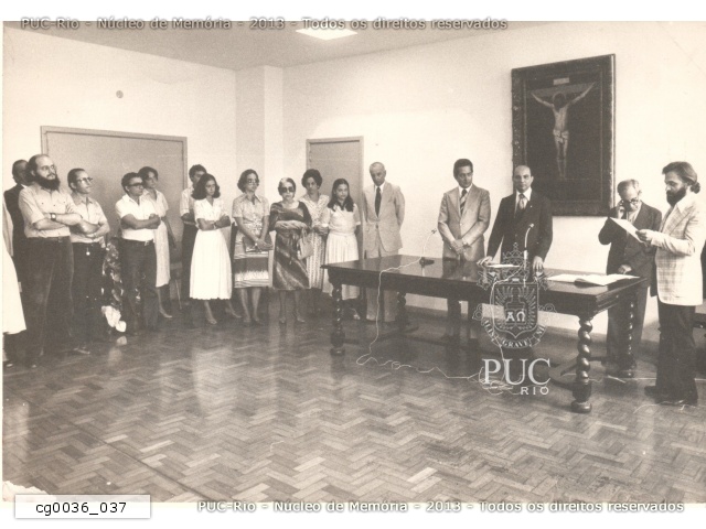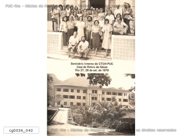 Grupo formado pelo reitor, pelos diretores de departamentos, professores, coordenadores e alunos representantes do corpo discente participantes do Seminário Interno do CTCH, realizado na Casa da Gávea nos dias 27 e 28 de setembro de 1979. O seminário promoveu a troca de informações e a integração entre os departamentos constitutivos do CTCH e seus respectivos diretores para a elaboração de um Plano Diretor da PUC-Rio. |