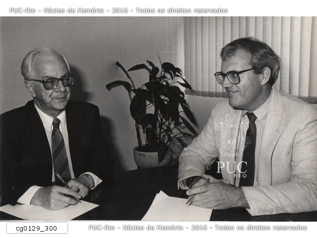 O Reitor Padre Laércio Dias de Moura S.J. e o Diretor de Marketing da IBM, Júlio Alvarenga, à direita, assinam um convênio para a criação do curso de extensão Gestão de artes e tecnologia multimídia. Segundo matéria do Jornal da PUC, o curso foi o primeiro a abordar a multimídia na América Latina. |