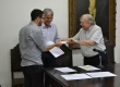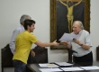 O funcionário Enimar Lopes recebe o diploma de Honra ao Mérito das mãos do Padre Ivern S.J. em agradecimento aos 40 anos de trabalho na PUC-Rio. |