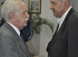 Convidado cumprimentando o Reitor Pe. Josafá S.J. na mesa de autógrafos. |
