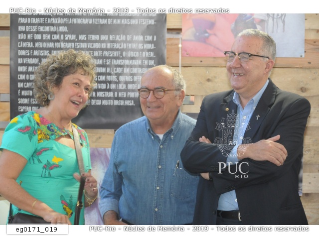 A profa. Cristina Bravo, o prof. Augusto Sampaio e o reitor prof. pe. Josafá S.J. em visita à exposição. |