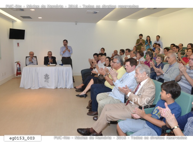 Mesa e plateia aplaudem o novo professor titular da PUC-Rio, Marco Antônio Casanova. |