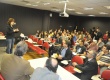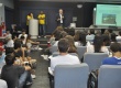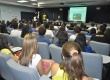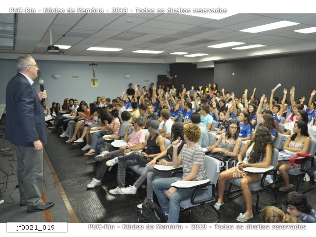 Apresentação da palestra O diferencial da PUC-Rio - Vestibular e ENEM, para alunos pré-vestibulandos visitantes, dos quais muitos estão com as mãos levantadas, aparentemente todos de uma mesma escola. |