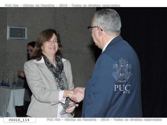 Aluna recebe o certificado de participação no XX Seminário de Iniciação Científica da PUC-Rio e recebe os cumprimentos do Reitor Pe. Josafá S.J.. |