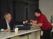 O professor André Trigueiro, do Departamento de Comunicação Social e o reitor da PUC-Rio Padre Josafá Siqueira S.J. na palestra sobre o panorama ambiental no Brasil. |