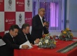 O reitor Padre Josafá fala na cerimônia de assinatura do convênio de apoio à Agenda Ambiental PUC-Rio e Santander Universidades. À mesa, além dos representantes da PUC-Rio, estão Jamil Hannouche, vice-presidente, e Afrânio Pereira, superintendete do Grupo Santander Universidades. |