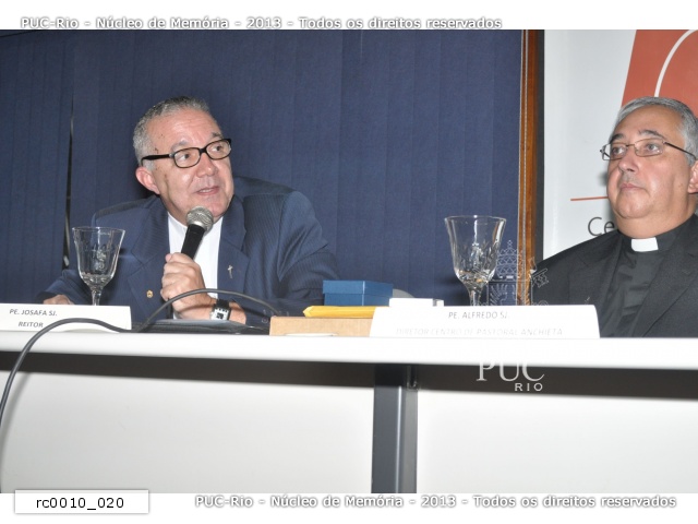 Os padres Josafá Siqueira S.J. e Alfredo Sampaio Costa compõem mesa durante evento. |