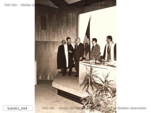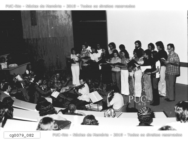 Plateia presente na comemoração do Jubileu de Prata da PUC-Rio. Na ocasião, com a presença do Embaixador da Alemanha Ocidental, foi inaugurado o prédio da Biblioteca Central e as novas instalações da Reitoria, ainda em obras, e houve a entrega das medalhas Cardeal Leme aos professores e o descerramento das placas aos benfeitores. |