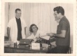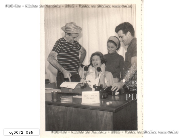 Grupo de pessoas no Depto.de Física. Padre Thomas Lynch Cullen S.J, vestido de carioca, ao lado do prof. Pierre Lucie, festejando o recebimento por ambos do título de Carioca Honorário, oferecido pelo jornal O Globo. |