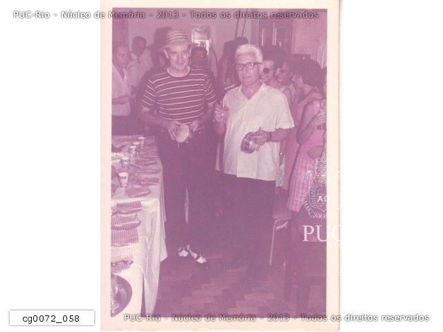 Padre Thomas Lynch Cullen S.J, com tamborim, vestido de carioca, ao lado do prof. Pierre Lucie, festejando o recebimento por ambos do título de Carioca Honorário, oferecido pelo jornal O Globo. |