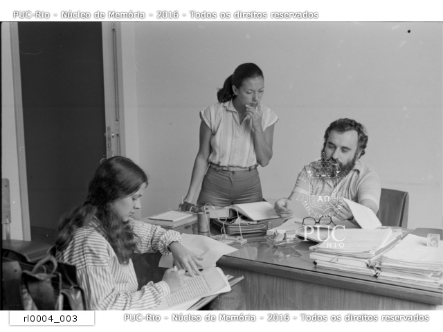 Os professores Wilmar Barbosa, Raul Landim, Guido de Almeida, Carlos Alberto Santos e a aluna Ethel M. R. B. Alvarenga apresentam o Departamento de Filosofia no Seminário Interno do CTCH, realizado na Casa da Gávea nos dias 27 e 28 de setembro de 1979. O seminário promoveu a troca de informações e a integração entre os departamentos constitutivos do CTCH e seus respectivos diretores para a elaboração de um Plano Diretor da PUC-Rio. |