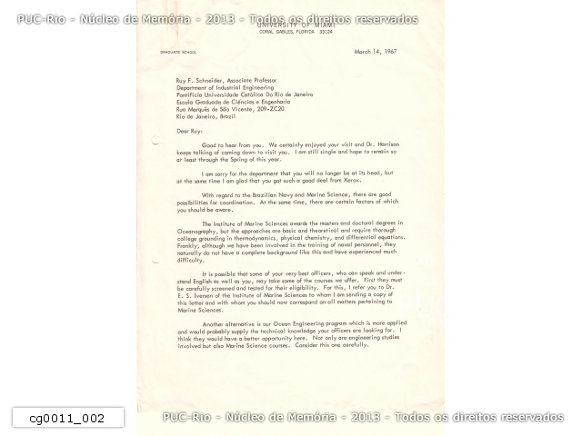 Correspondência de Leonard J. Greenfield (University of Miami) para o prof. Ruy Schneider (IND). Sobre a possibilidade de intercâmbio em Oceanografia, Ciências Marinhas e Navegação. |