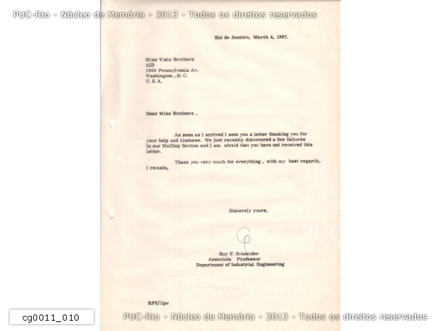 Correspondência do prof. Ruy Schneider (IND) para Miss Viola Brother (AID). |
