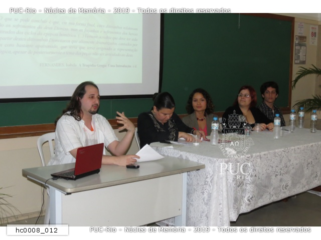 Palestrantes da mesa II da Jornada de História Antiga, com o tema Deuses e Heróis na antiguidade greco-latina. O aluno de graduação Daniel Queiróz fala sobre o êxtase e a ordem na tragédia grega. |