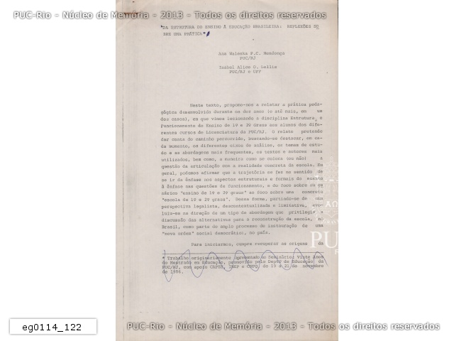 Artigo intitulado 'Da estrutura do ensino à educação brasileira: reflexões sobre uma prática' de autoria das professoras Ana Walesca Mendonça e Isabel Alice Lellis, apresentado no seminário dos 20 anos do mestrado em Educação da PUC-Rio. |