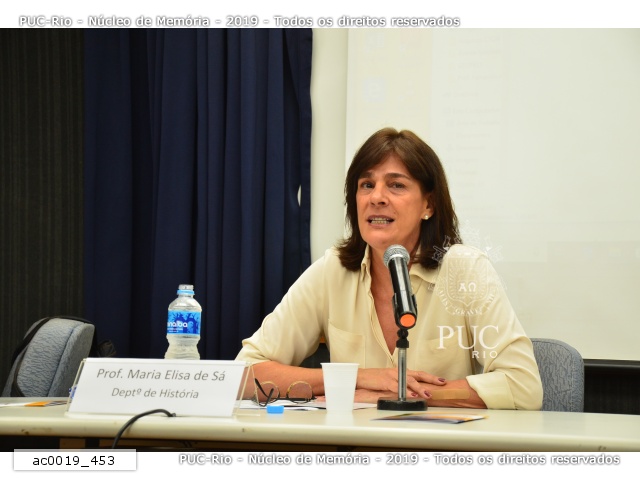 A professora diretora do Departamento de História, Maria Elisa Noronha de Sá, no debate e lançamento do livro "A Doença e o Tempo", escrito pelo professor Eduardo Jardim, do Departamento de Filosofia. |