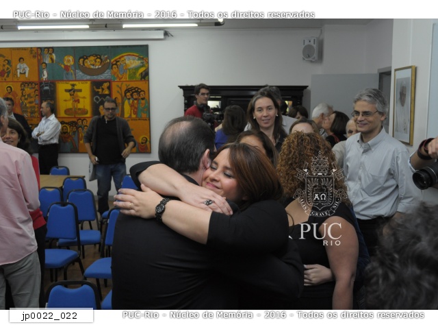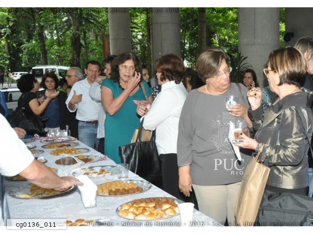 Confraternização após a Assembleia Universitária. Na foto, entre outros, a Profa. Maria Sarah da Silva Telles (CIS), Profa. Ângela Randolpho Paiva (CIS), Prof. Pe. Pedro Magalhães Ferreira S.J. (ELE), Ana Waleska, Profa. Marlene Sabino Pontes (CETUC) e Maria José Teixeira Soares (VRD). |