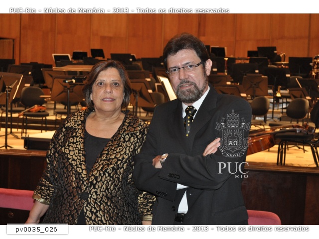 No Theatro Municipal, a Professora Marlene Pontes e o Professor Luiz da Silva Mello, na noite do concerto em homenagem ao Padre Hortal pelos 15 anos em que esteve à frente da reitoria da PUC-Rio. |
