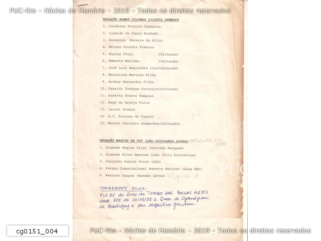 Relação de nomes dos beneméritos das campanhas financeiras da PUC-Rio dos anos 1960 que receberam placas de bronze com seus nomes afixadas nas colunas do Edifício da Amizade. Constam 15 nomes. Relação de marcos da PUC-Rio, na qual são listados cinco locais que seriam nomeados em homenagem a doadores e figuras ilustres da PUC-Rio. Registro manuscrito posteriormente com dados sobre o tombamento do Solar Grandjean de Montigny. |