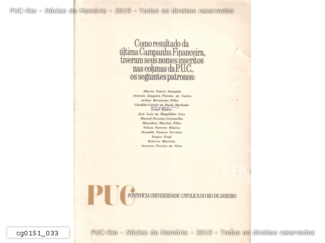 Papel timbrado da Campanha Financeira de 1963, com os nomes de todos os organizadores da Campanha, do Conselho de Curadores, dos Grandes Patronos, da Comissão de Honra da Universidade (composta pelo Presidente João Goulart, pelo Governador Carlos Lacerda, por Dom Armando Lombardi, e por cardeais, deputados, senadores e pessoas ligadas diretamente à PUC-RIo), dos responsáveis pela Divulgação, pelas Promomoções Sociais e a Comissão de Planejamento. |
