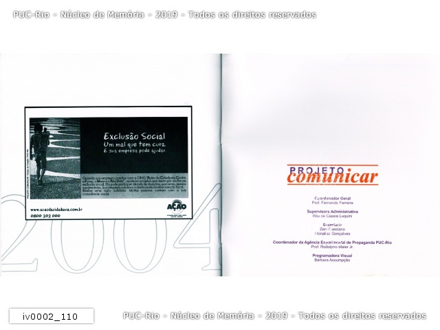 Folder sobre o Núcleo de Criação do Projeto Comunicar. Campanhas produzidas ao longo dos anos. Ação da Cidadania. Equipe do Projeto Comunicar. |