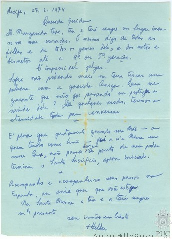 Quero também rememorar algo ainda mais pessoal. Tenho mais de uma carta do padre Helder, e guardo comigo a caixinha forrada de papel prateado em que minha avó conservou as muitas cartas pessoais que recebeu dele. Uma carta é, para mim, muito especial, escrita com a letrinha dele, em papel fino azul hoje já meio amarelado, com caneta tinteiro na inesquecível coloração “azul real lavável” das tintas Parker. Essa carta foi escrita quando minha avó, a D. Margarida do começo dessa história, morreu, no ano de 1974. Eu estava fora do Brasil. Não é preciso dizer que o ano de 1974, no país, foi um momento de tensões imensas e de polarização muito forte, no qual, com freqüência, pessoas da mesma família se posicionavam em campos diversos e mesmo opostos. Em 1974, o padre Helder, já arcebispo de Olinda e Recife, veio ao Rio. Minha avó estava no hospital, já muito mal, e ele foi visitá-la, despedir-se dela. A pessoa da minha família que a acompanhava no momento em ele chegou ao quarto do hospital não o deixou entrar. Na época, eu morava em Madrid e escrevia a tese de doutorado, e quando soube do ocorrido por uma carta de minha mãe, enlouqueci. Para mim, aquilo foi uma coisa absolutamente perversa e absurda, e escrevi para ele dizendo que achava o que tinha acontecido um horror. Ele mandou de volta uma carta, não muito longa, e que dizia, entre outras coisas, o seguinte: