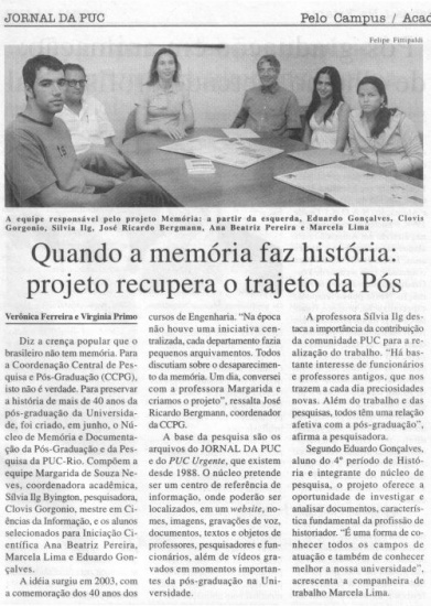 O primeiro resultado será o lançamento do principal suporte do Núcleo de Memória da Pós-Graduação e da Pesquisa na PUC-Rio, um site hospedado no site da PUC-Rio, previsto para o segundo semestre de 2007.
