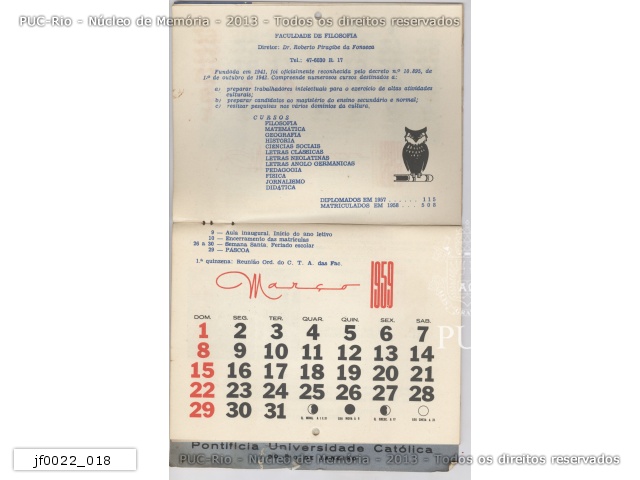 Mês de Março no Calendário da PUC-Rio referente ao ano de 1959. Contém informações sobre a Faculdade de Filosofia, incluindo número de diplomados e matriculados no ano. |