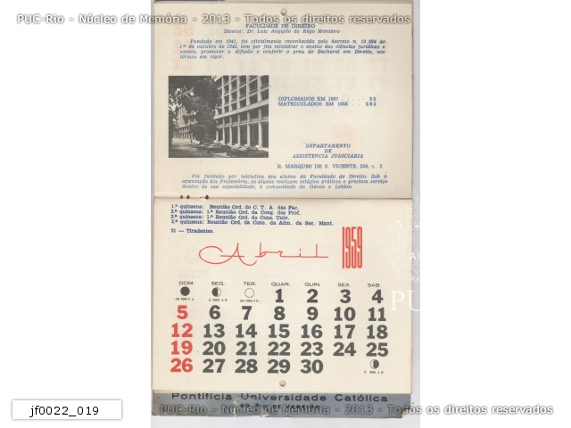 Mês de Abril no Calendário da PUC-Rio referente ao ano de 1959. Contém informações sobre a Faculdade de Direito. Foto da frente do Edifício Central, depois Cardeal Leme. |
